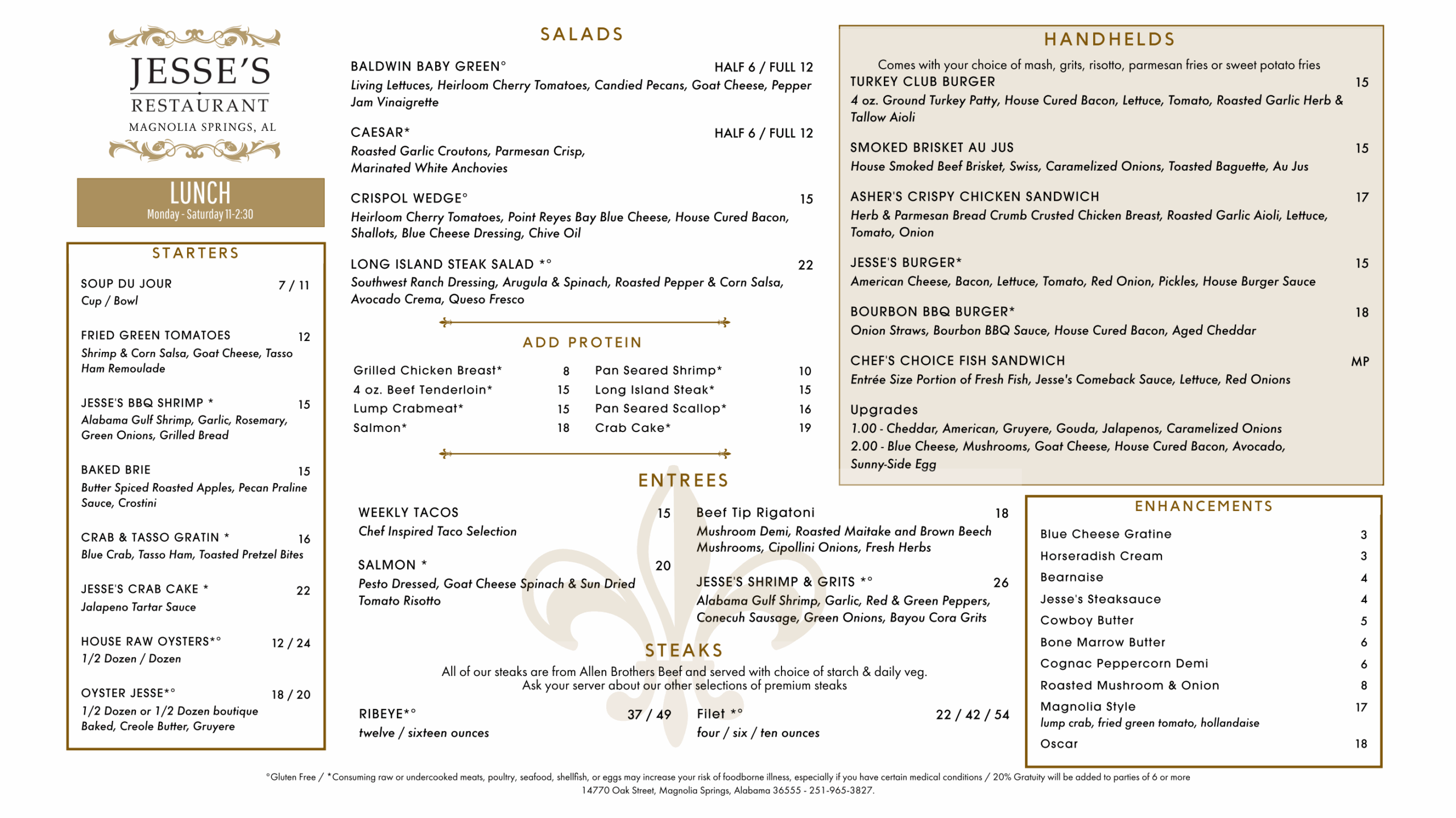 We encourage reservations prior to dining so we may accommodate you and your party at the time of arrival. Since we offer several rooms to choose from, we prefer our guests call to make reservations allowing us to obtain the details of your visit so we may provide the best dining experience Jesse’s has to offer. When making reservations online, please note if this is a special occasion, your preferred dining room, or if this is your first visit.